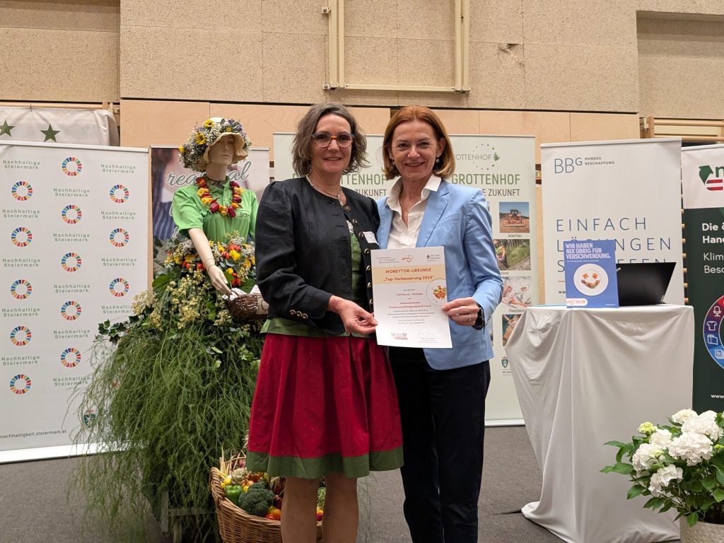 Das Nachmittagsprogramm legte den Schwerpunkt auf das Thema Lebensmittelabfallvermeidung im Rahmen des Großküchen-Gipfels des Landes Steiermark. Hier wurde, unterlegt durch Erfolgsbeispiele aus der Praxis die Zielsetzung verfolgt, die Möglichkeiten der Kostenersparnis im Zusammenhang mit einer Reduktion des Lebensmittelabfalls in Betrieben darzustellen. Die rund hundert Teilnehmenden am Großküchen-Gipfel, der durch United Against Waste organisiert wurde, konnten hier wertvolle Informationen und Tipps für die Umsetzung in ihren Großküchen mitnehmen. Als Höhepunkt und Abschluss des Großküchen-Gipfels wurden erfolgreiche Großküchen für ihre Leistungen in der Einsparung von vermeidbaren Lebensmittelabfällen ausgezeichnet.